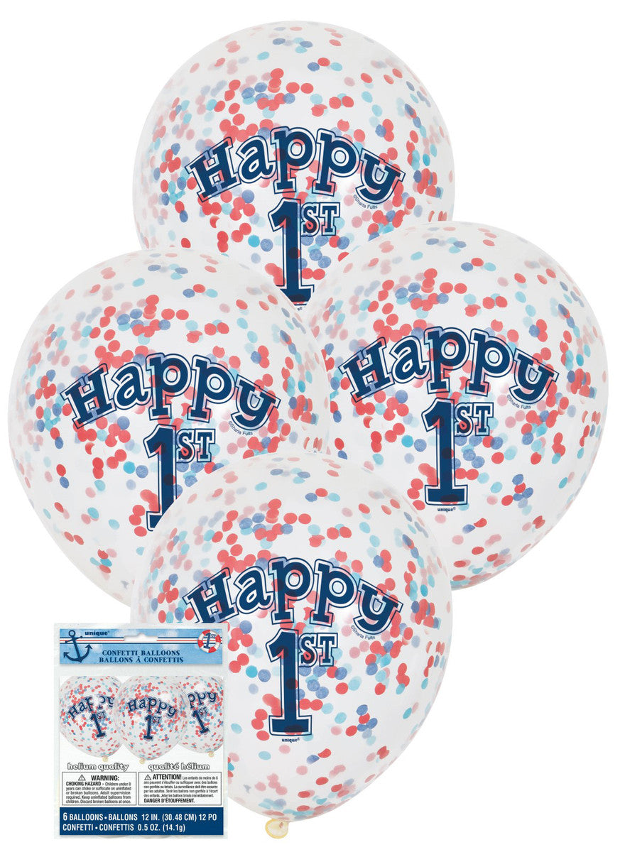 1ST BIRTHDAY 30cm (12") CLEAR BALLOONS WITH BLUE & RED Confetti 6pk